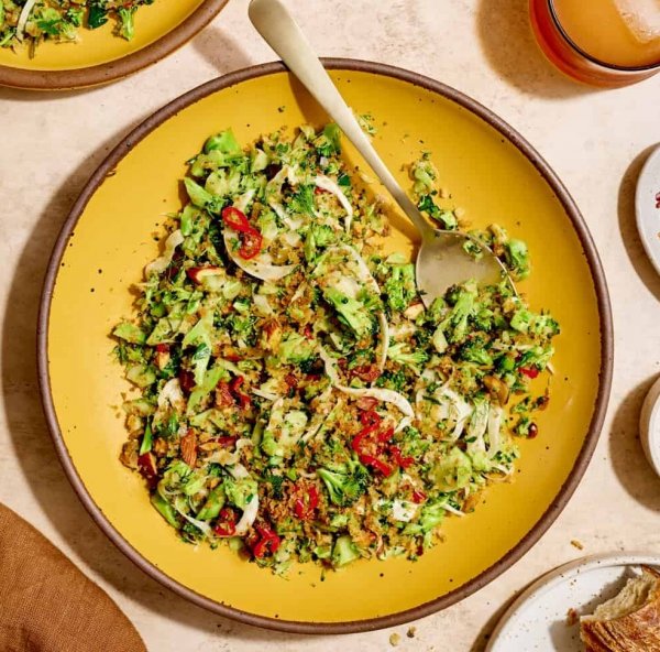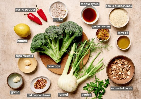 - Add the broccoli, fennel, and parsley to a large serving bowl. Pour in some of the dressing and toss. Add more dressing as desired and toss again. Season to taste with salt and pepper. Add your panko crumbs and nuts and toss again. Enjoy.