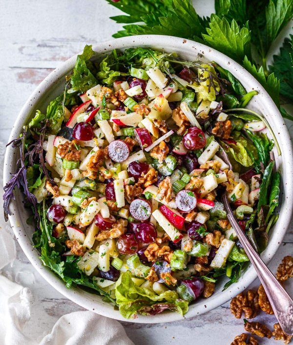 Combine the salad- Add cabbage, celery, grapes, and apples to the bowl with the dressing an toss well to combine. Top with walnuts and serve.