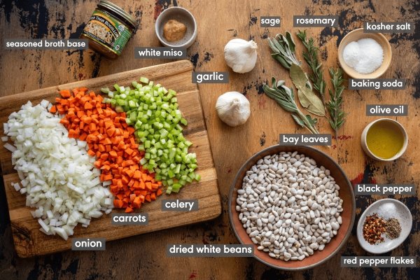 - Once the beans have boiled for 10 minutes, turn off the heat. Add in the garlic heads. Cook until beans are tender, 40 Pick out the bouquet garni (discard). Scoop a ladle of hot broth into a glass. Add the miso to the hot broth; whisk well until miso is dissolved. Pour miso broth into the soup and stir well.